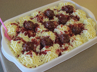 These were just normal cupcakes lightly iced with the creamy colored icing. I then placed them in a pan and drizzled the remainder of icing all over the top to look like noodles. Take the Ferrero Rocher chocolate candies and roll them in strawberry jelly, place them around the top. Add a small amount of water to the jelly and stir well. Once you have thinned out the jelly spoon it over the dish then serve.