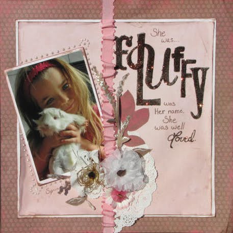 For a good solid coat of glitter on chipboard I have always used Wonder Film. It makes a spectacular finish. But on this layout I was distressing a lot with my inks and felt it I wanted a distressed title due to the subject matter (this is a pet that is no longer with us). So I took out my Helmar Gemstone Glue (It wont cloud Gemstones and I figured it would be a good glue to use with glitter) put a little pile of it on my splat mat and started painting it onto my letters with my finger. Making sure to get different thicknesses and not always getting the edges. Dusting it immediately with chocolate Glitter Glitz made this title just the way I want it. Still tons of glitz but with a kinda grungy, distressed look around the edges.