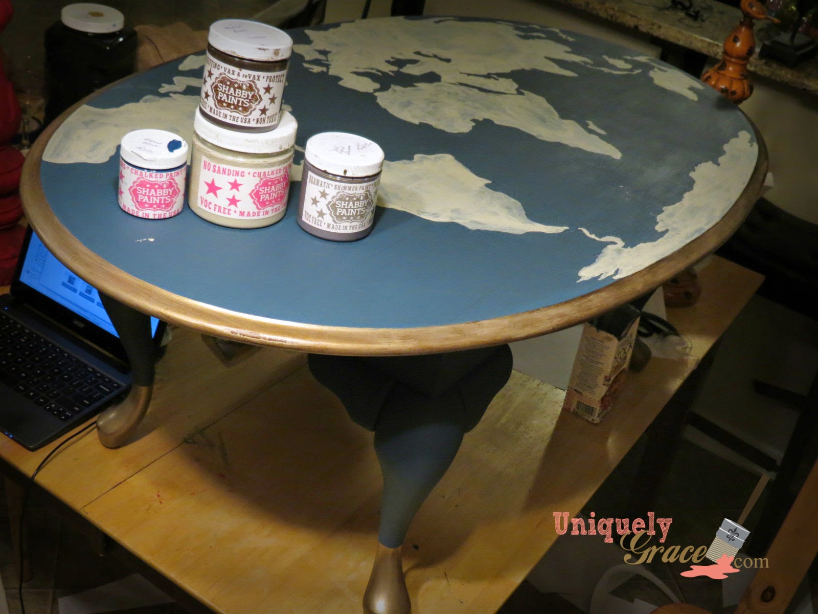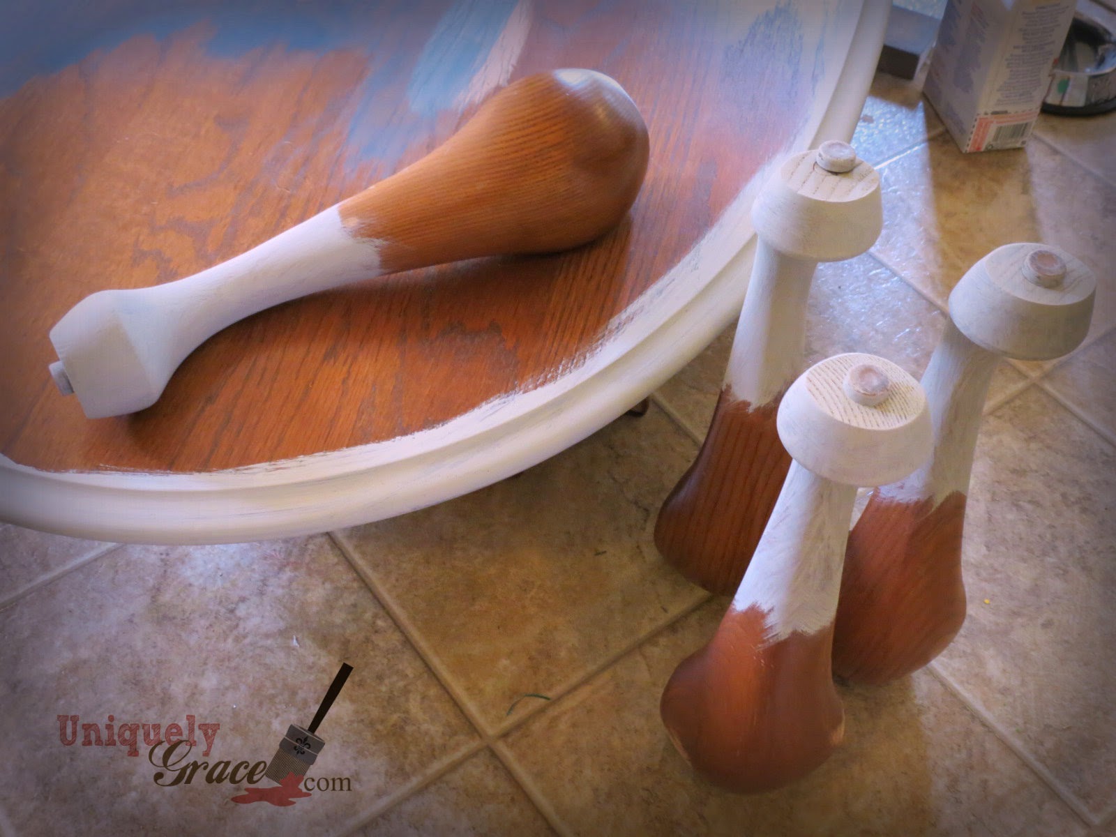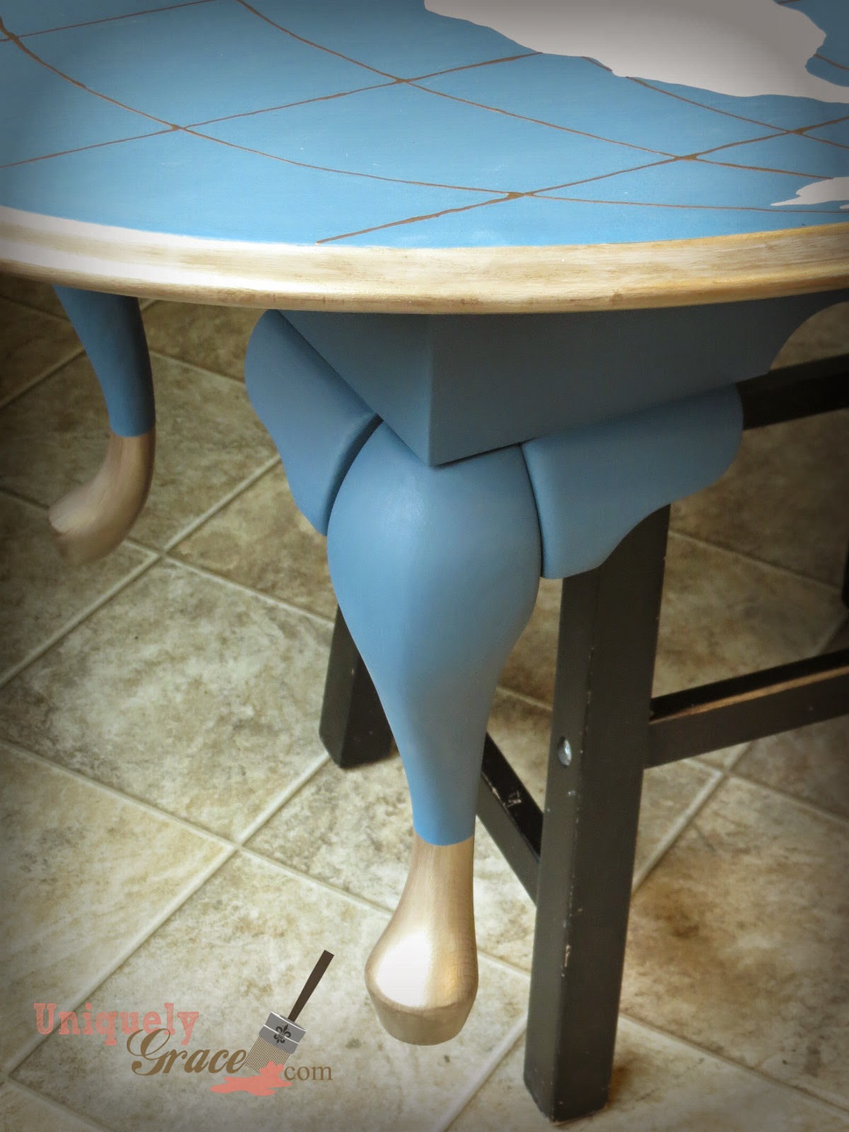Once the blue was cured over night I dry brushed the Old gold on the underside of the table with a chip brush. Don’t you just love the depth it adds to the legs?
