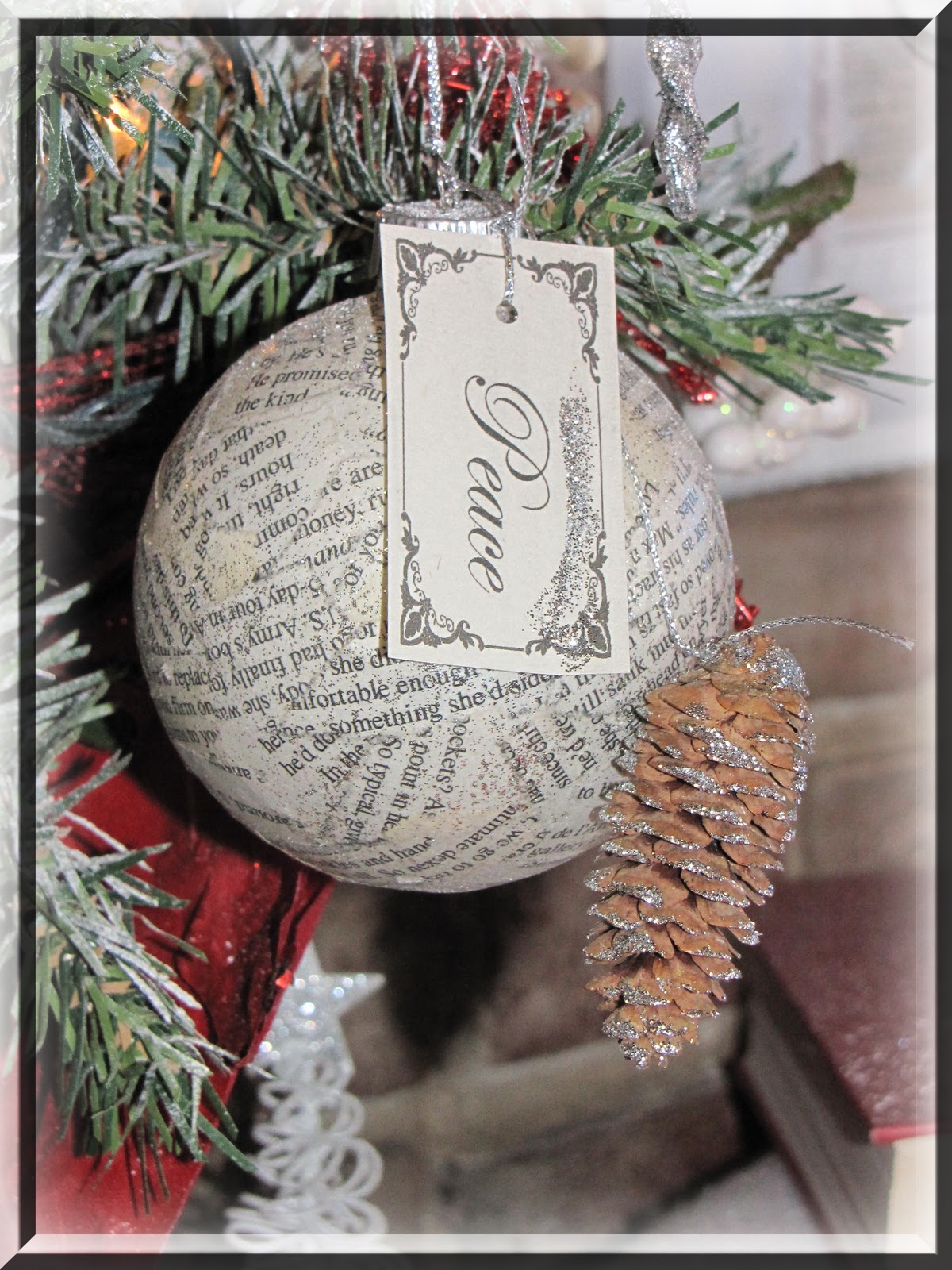 Today I want to share with you another ornament I made from book pages. I wish I could capture the glistening glitter a bit better… however I still love the way they look. I made five of them with these words on them: