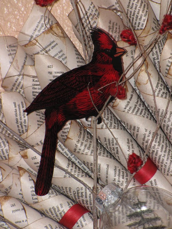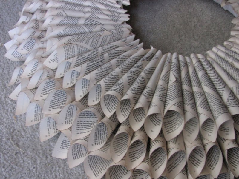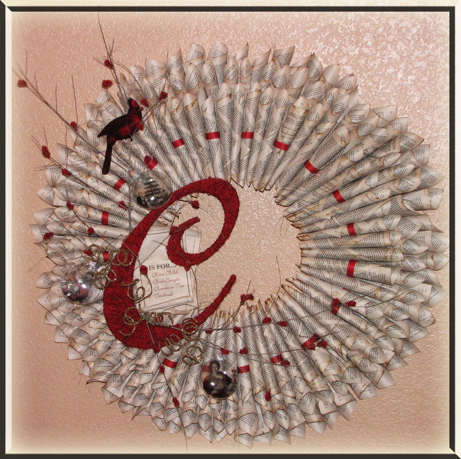 STEP 10 – Glue the Cream City Ribbon under one page cone on the front layer of the wreath. Weave above and under pages all around the wreath, repeat with gold thread if desired. Here you can see the Natural Red Cream City Ribbon doing this.