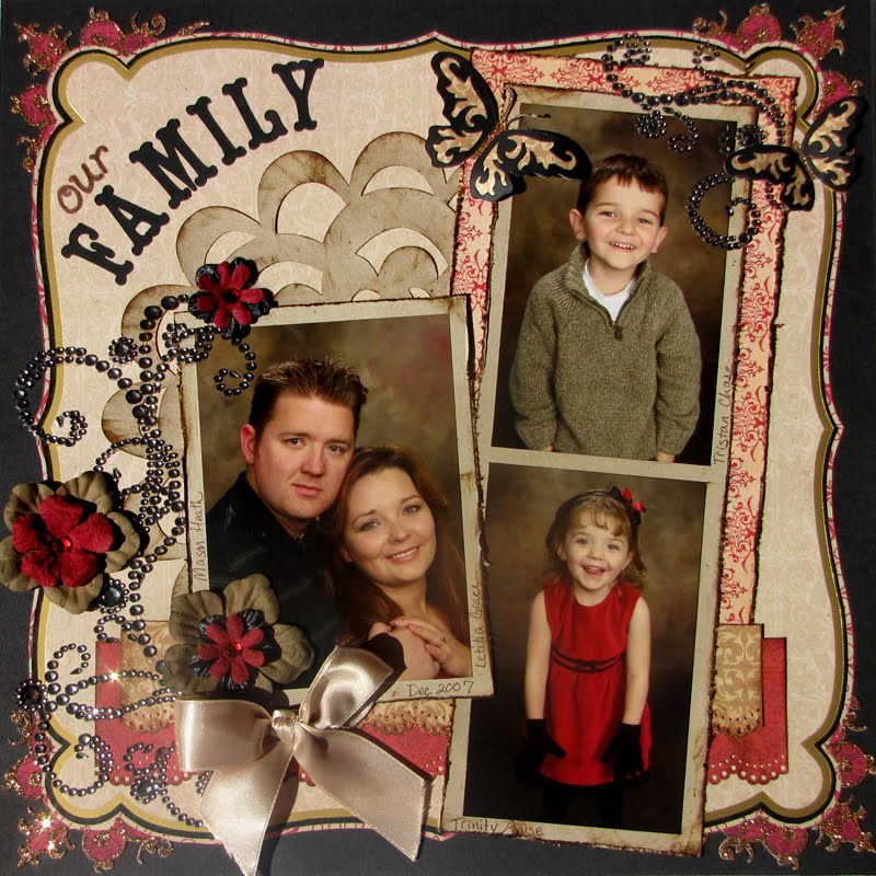 Guess what! It worked! I truly love these layouts. Sweet and elegant indeed. The first one I would like to show you has several pictures of our family. Here I used P K Glitz’s NST Copper Glitter to accent the corners of the layout and the butterflies. Working with just those few elements added a since of formal framing to the layout and a splash of whimsy and playfulness with the butterflies. Both of which accent the photos perfectly.