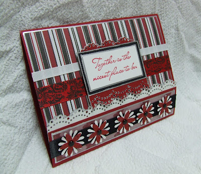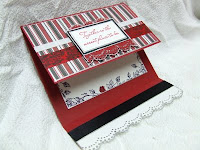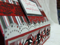 It is a tri-fold off centered and the sentiment is raised up with pop dots to allow the white lace punched boarder to fit under the red lace punched boarder to keep itself closed. I used all the scraps from this LO and I love the end result.