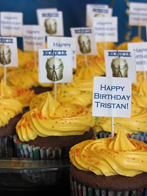 I created the little topper of the cupcakes on the computer… they were 1″ square. I printed them so that the image square was upside down touching the top of the text square. This way when I cut them out I cut them 1″ x 2″. Folded them in half over a toothpick after adding some mono adhesive to the back of each topper. The kids loved this! It was supper easy and more of them got excited about his party coming up later that weekend.