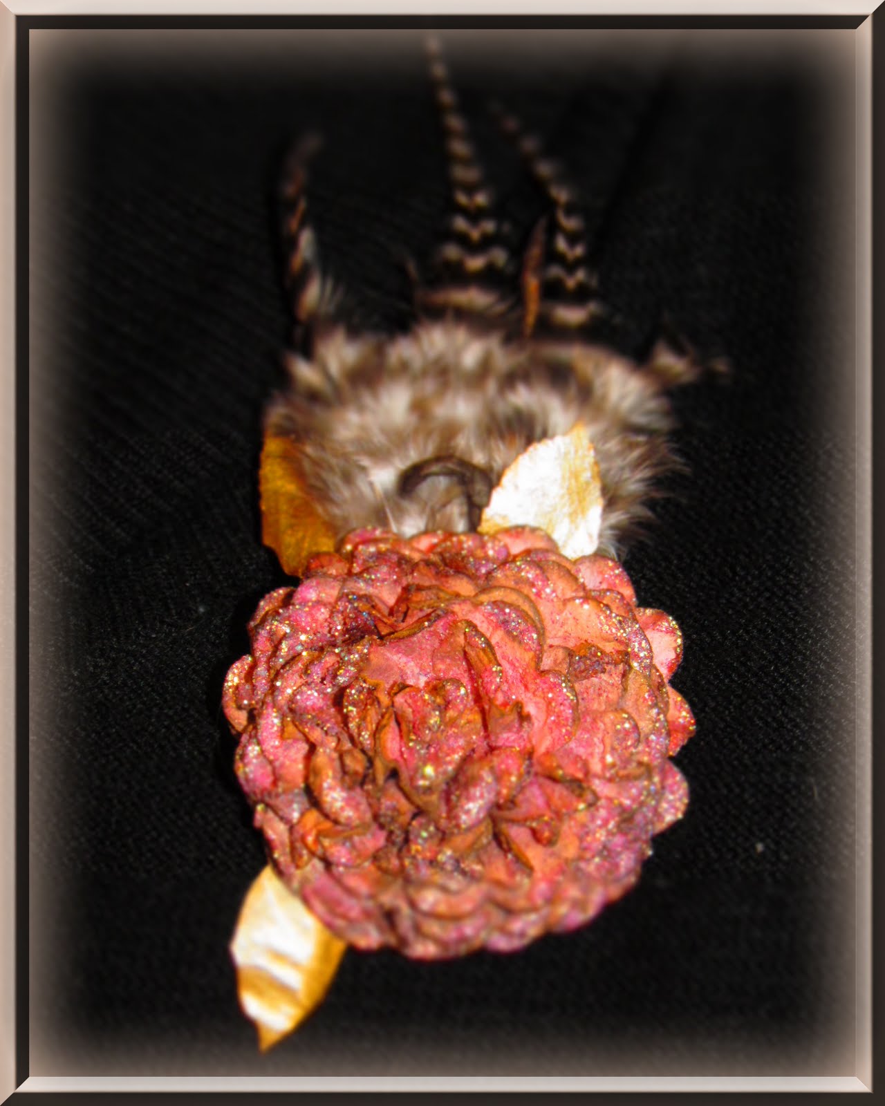 This is the hairband and the matching ring (below) that I made to wear the to the Expo. Can’t carry around my Scrapbook Albums or my Caring Card Tree now can I? Hehe! I had to make something from paper to express myself and show everyone what I can create. The red flowers are made from cardstock, a brad, some ink, Ritzy Ditzy Glitz, 3 D Crystal Lacquer and of course some glitter!The Gold and black flower is made from ribbon and the netting in the background was plain white. I inked it up added some Glue Dots and then flocked them with black.