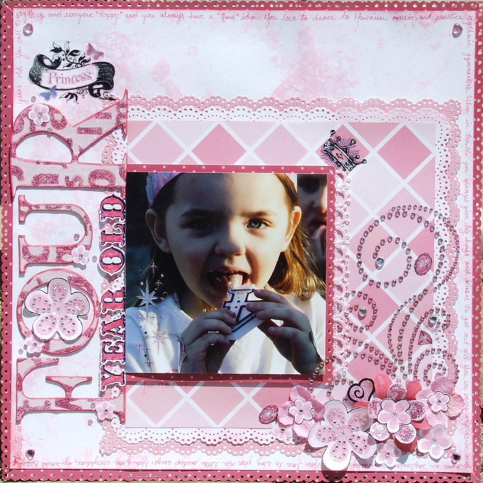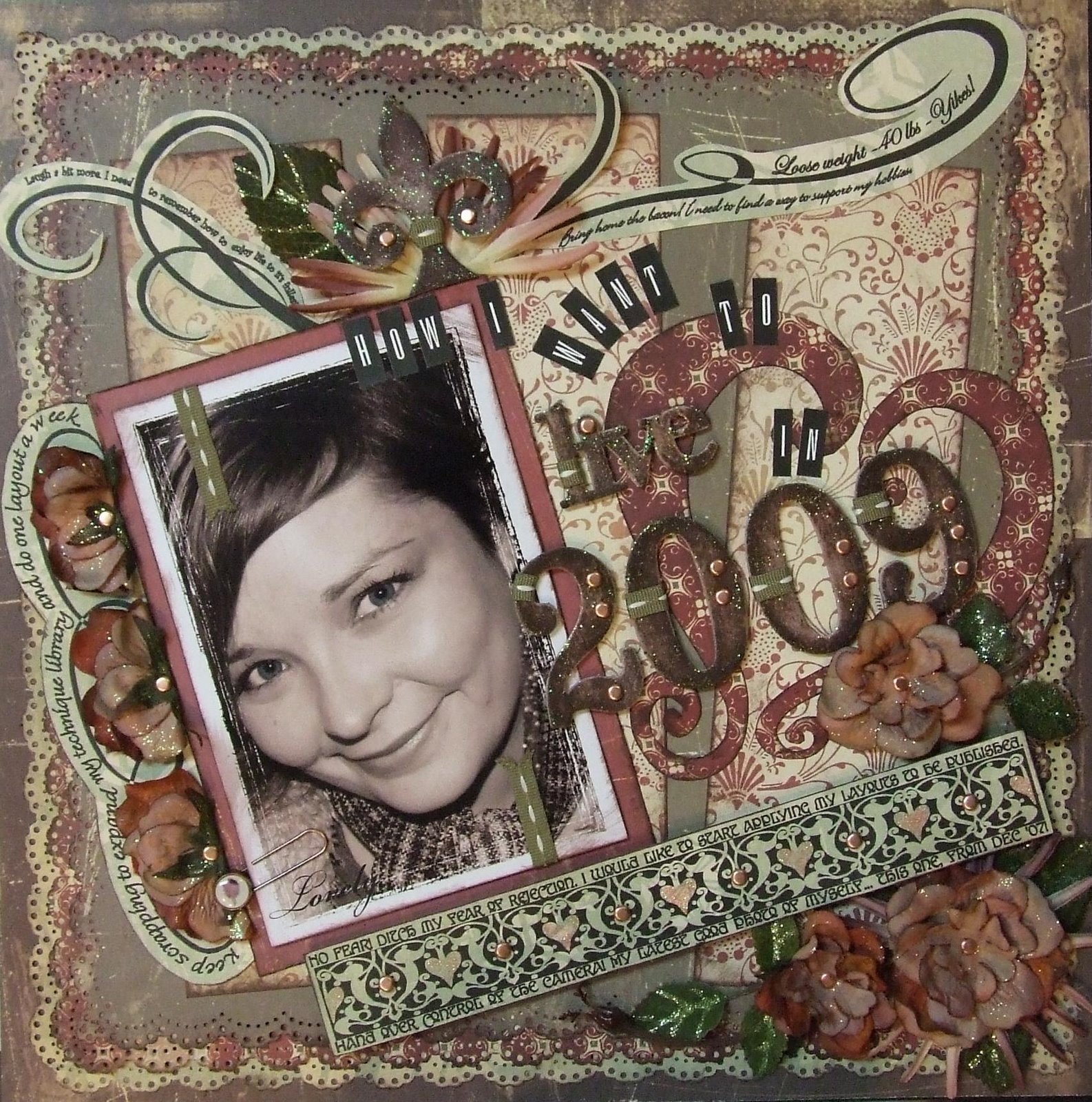 Method # 1: The chipboard on this layout has several things going on. It’s inked in two tones, glittered slightly, and embellished with brads and ribbon. I love this layout!