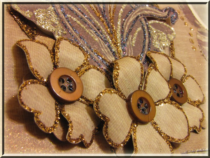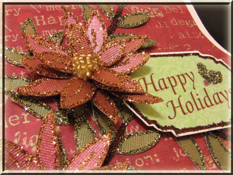 The leaves are spritzed with Emerald Ritzy Ditzy Glitz and have Chocolate and Gilded Grape Leaf, PK Glitter Glitz details. The Poinsettias have Garnet Ritzy Ditzy Glitz and Cinnabun P K Glitter Glitz details. I also took a sticker and glitzed it out for the sentiment.