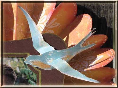 This sweet 3D bird was created from two the these in 2D. The accordion flower behind this brown frame had these sweet little blue birds on them. I cut them out and then used the cricut to cut out the scalloped circle I then turned into the large 11″ flower.