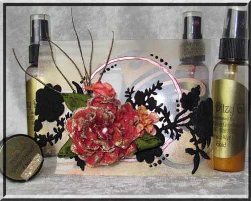 For the flower I used my cricut to cut out several layers of the same flower in different sizes. I stacked the flowers and used a brad in the center to hold them together. I got them wet and gently crushed the petals into the center of the flower. I used my heat gun to dry it for a min just to get the moistness off and started slowly un-crushing them until I liked the look and shape. I spritzed it with Bronze Ritzy Ditzy Glitz and added some gold in then used my 3D Crystal Lacquer along the edges of the petals. While the adhesive was still wet I dusted it with some Clear Glitter Glitz. Here is a closer look.